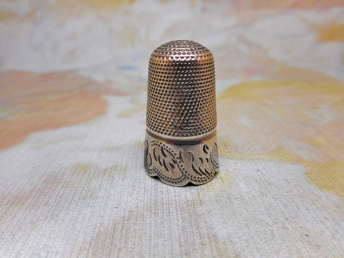 A silver thimble with a raised decorative border. c1870
